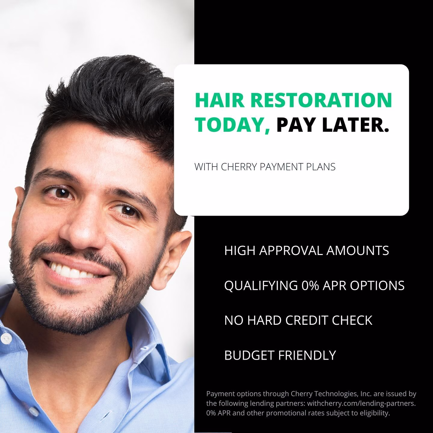 Investing in hair restoration is an important decision, and we’re here to make it as seamless and accessible as possible. At Aesthetemed, we proudly offer flexible financing options through Cherry Payment Plans, up to 12 months of interest free financing on approved applications.